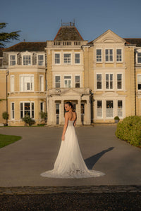 Elegant satin A-line bridal gown featuring floral detailing across the bust, hem, and train. This stunning gown combines timeless silhouette with romantic embellishments for a breath-taking wedding day look.